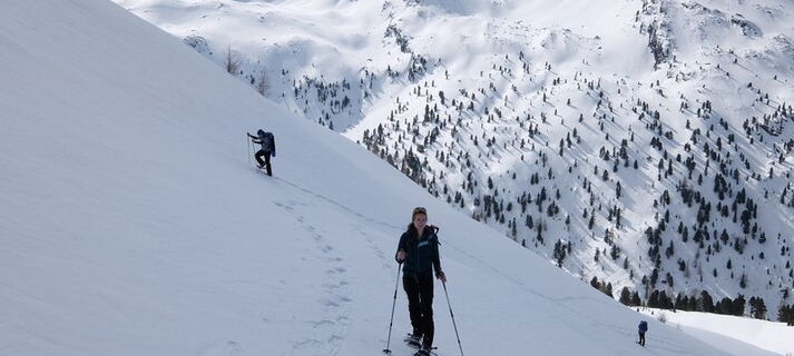 Der Aufstieg zu unserem Quartier, dem Meißner Haus (1.707 m) im Landschafts-Schutzgebiet Patscherkofel-Zirmberg, erfolgt entlang des Viggarbaches auf der als Rodelbahn präparierten Fahrstraße. Dank Gepäcktransport steigen wir die gut 600 m mit leichtem Rucksack ganz gemütlich auf. Nach einer kleinen Stärkung in der Hütte ziehen wir für eine LVS-Übung im Tiefschnee vor dem Haus die Schneeschuhe noch mal an und frischen das auf, worauf es bei der Lawinenverschüttetensuche ankommt.
