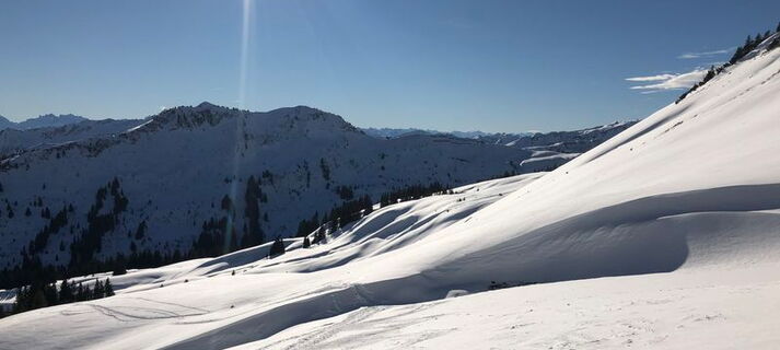 Nach ausgiebigem Frühstück in unserer schönen Unterkunft fahren wir zum Ausgangspunkt kurz vor Damüls. Nach dem Test wir unsere LVS-Geräte starten wir entlang eines Forstwegs, bis kurz danach eine Waldschneise abzweigt. Ab hier folgen wir der Skitourenspur einen mittelsteilen Anstieg hinauf bis zu einer Art Plateau, an dessen Ende im baumlosen Gelände die Mittelargenalpe thront. Hier können wir bereits den Blick schweifen lassen vom Hohen Ifen zum Diedamskopf und zu den Berggipfeln um Damüls. Auch unser Tagesziel – den Klippern – haben wir schon gut vor Augen.